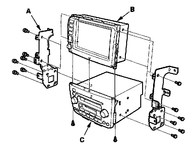3. Remove the bracket (A), then remove the display unit (B) from the audio unit (C).
