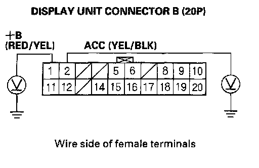 1. Turn the ignition switch to ACC (I).2. Measure the voltage between body ground and display unit connector B (20P) terminals No. 1 and No. 2 individually.