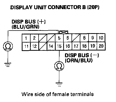 6. Check for continuity between body ground and display unit connector B (20P) terminals No. 5 and No. 15 individually.