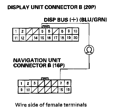 7. Check for continuity between display unit connector B (20P) terminal No. 5 and navigation unit connector B (16P) terminal No. 7.