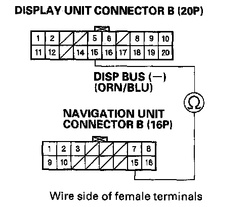 8. Check for continuity between display unit connector B (20P) terminal No. 15 and navigation unit 16P connector B(16P) terminal No. 15