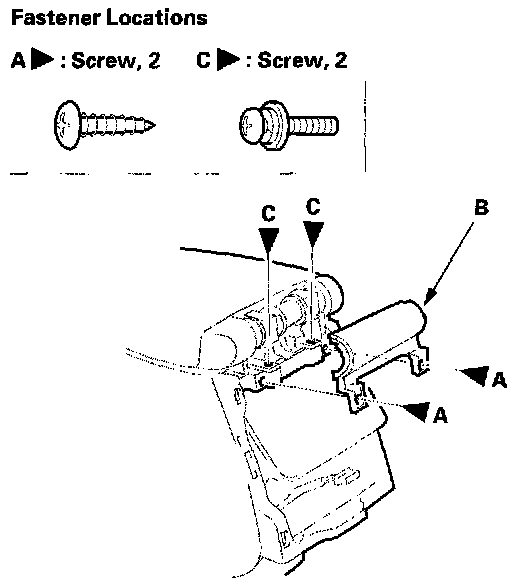 2. Remove the screws (A), then remove the rear hinge cover (B). Remove the hinge mounting screws (C).