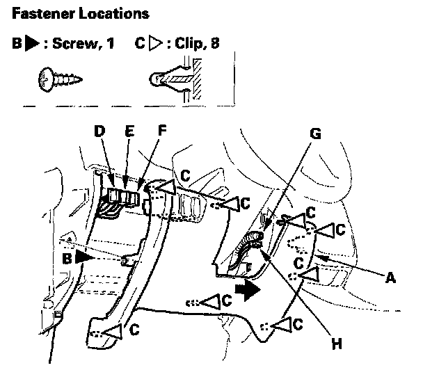 3. Disconnect the cruise control main switch connector (D), moonroof switch connector (E), fog light switch connector (F), air hose (G), and in-car temperature sensor connector (H), then remove the cover.