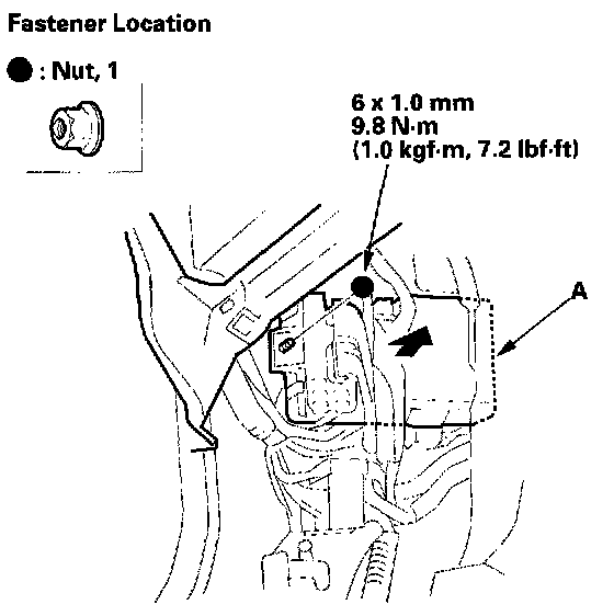 6. From under the dashboard on the driver's side, remove the nut, and pull out the fuse/relay box (A).