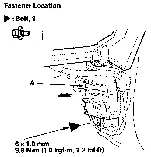 8. From under the passenger's dash, remove the bolt, and pull out the fuse/relay box (A).