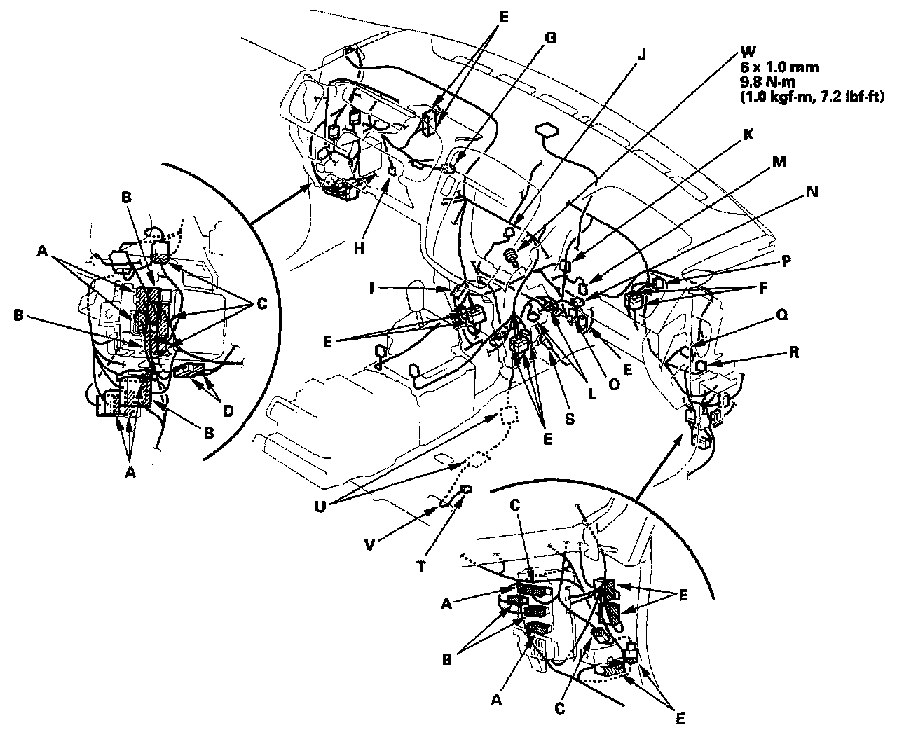 9. Disconnect the side wire harness connectors (A), engine compartment wire harness connectors (B), door wire harness connectors (C), moonroof wire harness connectors (D), dashboard wire harness connectors (E), steering hanger beam wire harness connectors (F), brake pedal position switch connector (G), parking brake switch connector (H), SRS wire harness connector (I), mode motor connector (J), ECM/PCM connector (K), SRS control unit connector (L), evaporator temperature sensor connector (M), air mix control motor connector (N), intake manifold runner control module connector (O), recirculation control motor connector (P), power transistor connector (Q), blower motor connector (R), and antenna lead (S). With navigation, disconnect the GPS antenna connector (T).