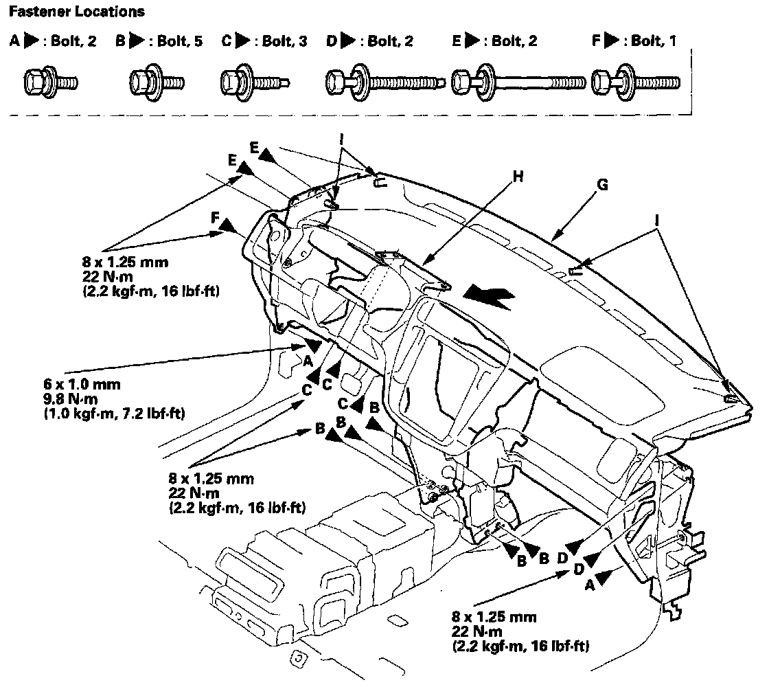 13. Remove the bolts (A, B, C, D, E, F), and lift up on the dashboard (G) to release the dashboard and steering hanger beam (H) from the guide pins (I).