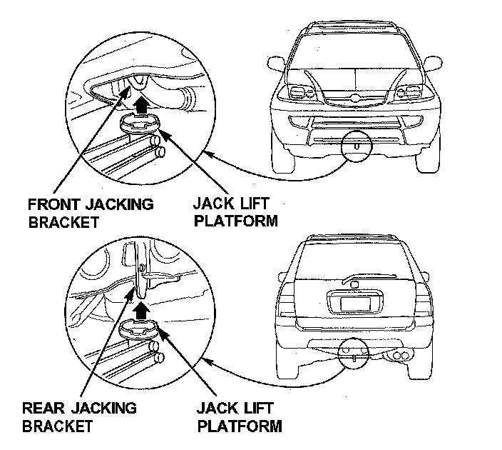 4. Position the floor jack under the front jacking bracket or rear jacking bracket, center the jack lift platform, on the jacking bracket and jack up the vehicle high enough to fit the safety stands under it.