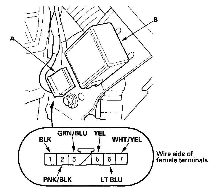 2. Disconnect the 7P connector (A) from the keyless receiver unit (B).
