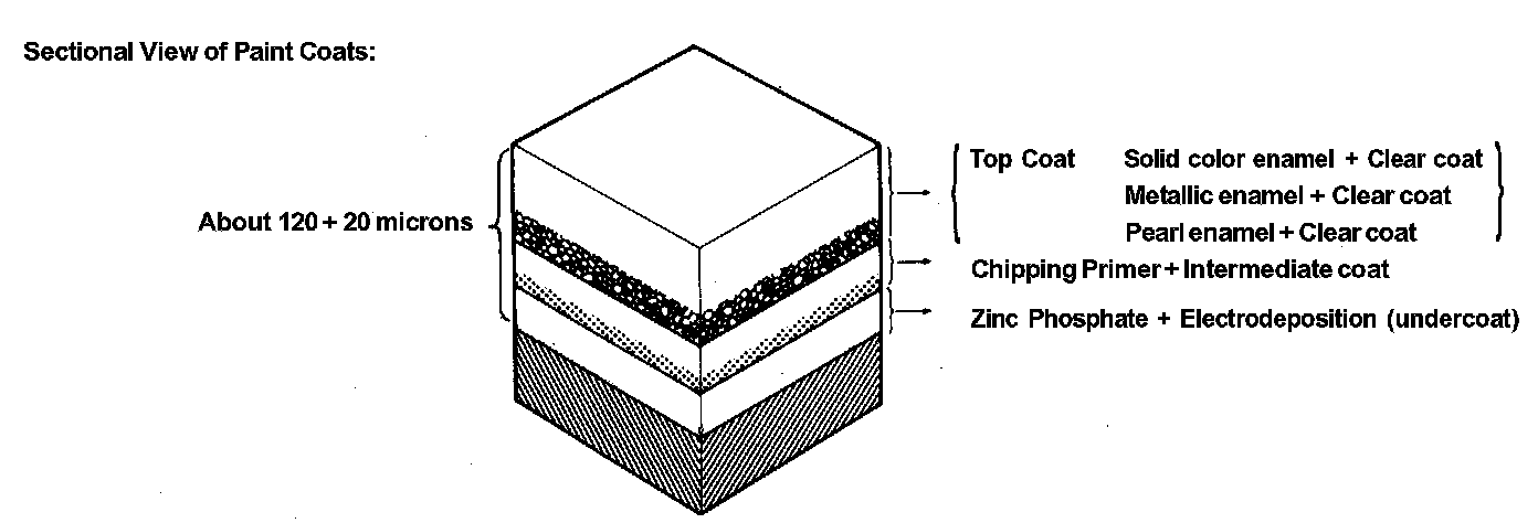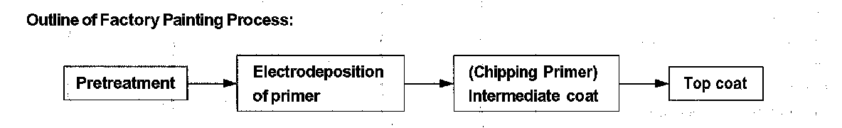 In the pretreatment process, the entire body is degreased, cleaned, and coated with zinc phosphate by dipping. After the body has been cleaned with pure water, it is placed in an electrolytic bath of soluble primer (Cationic Electrodeposition). This produces a thorough corrosion inhibiting coating on the inner surface and corners of the body, pillars, sills, and panel joints. Chipping primer is then applied to the most susceptible areas.