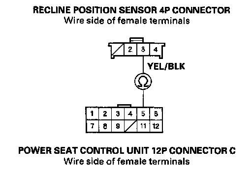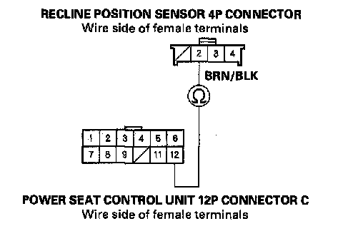 4. Check for continuity between the No. 2 terminal of the recline position sensor and C12 terminal of the power seat control unit.