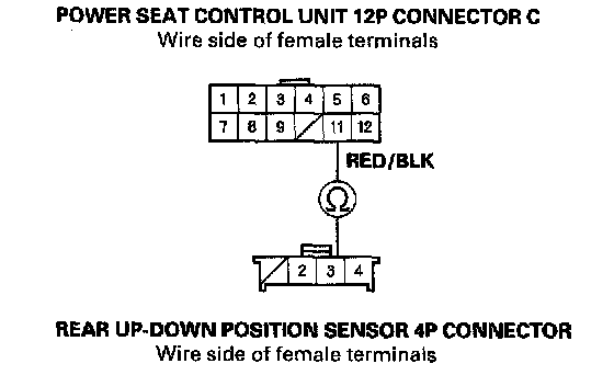 4. Check for continuity between the No. 2 terminal of the rear up-down position sensor and C12 terminal of the power seat control unit.