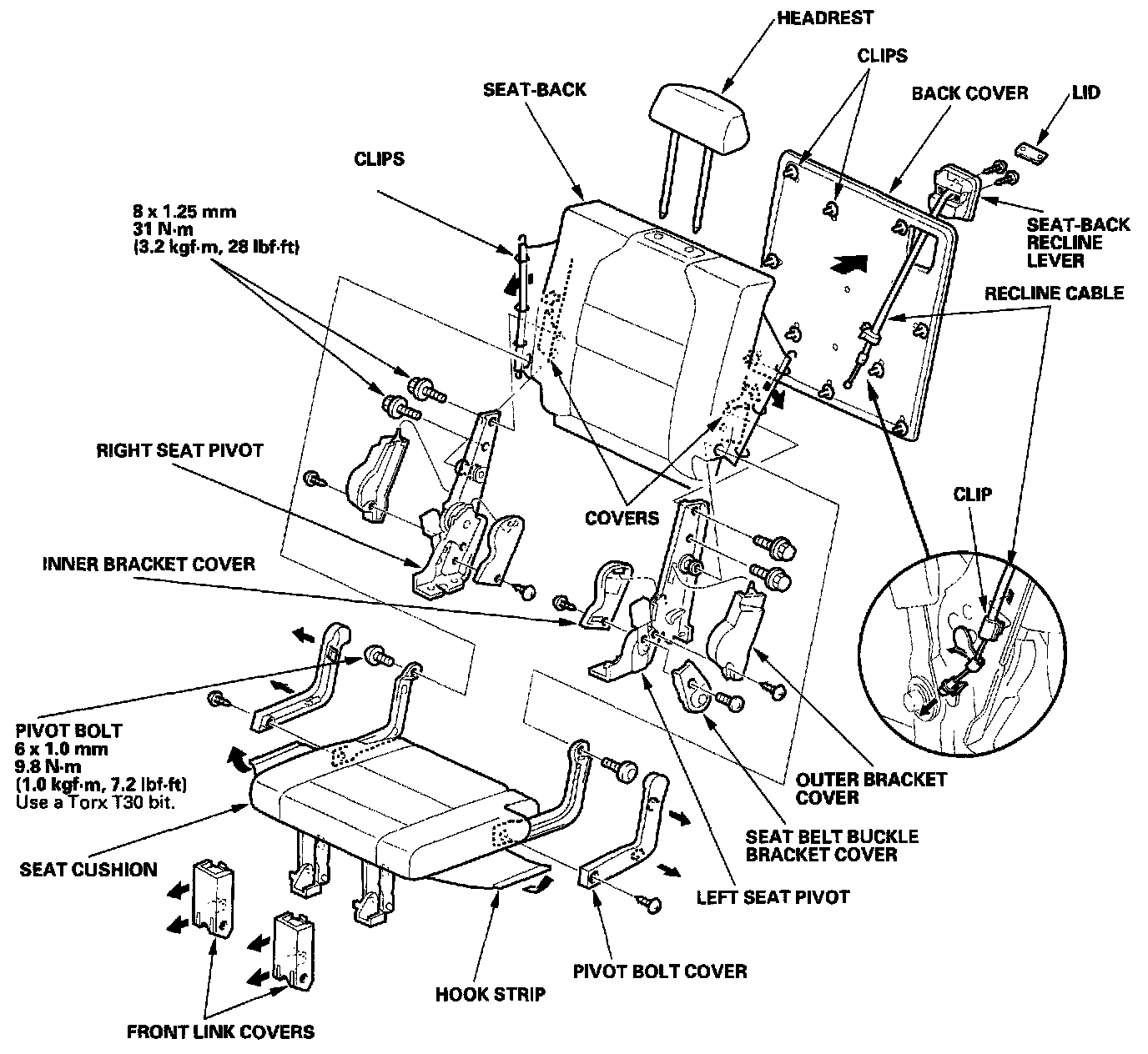 Third Row Seat Disassembly/ReassemblyDisassemble the third row seat as shown. Take care not to bend the seat-back recline cable.