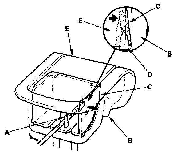 2. Carefully insert a flat-tip screwdriver through hole (A) in the housing (B), then press the inside face of the cover (C) outward against the housing to make a gap (D) between the lever (E) and the cover.