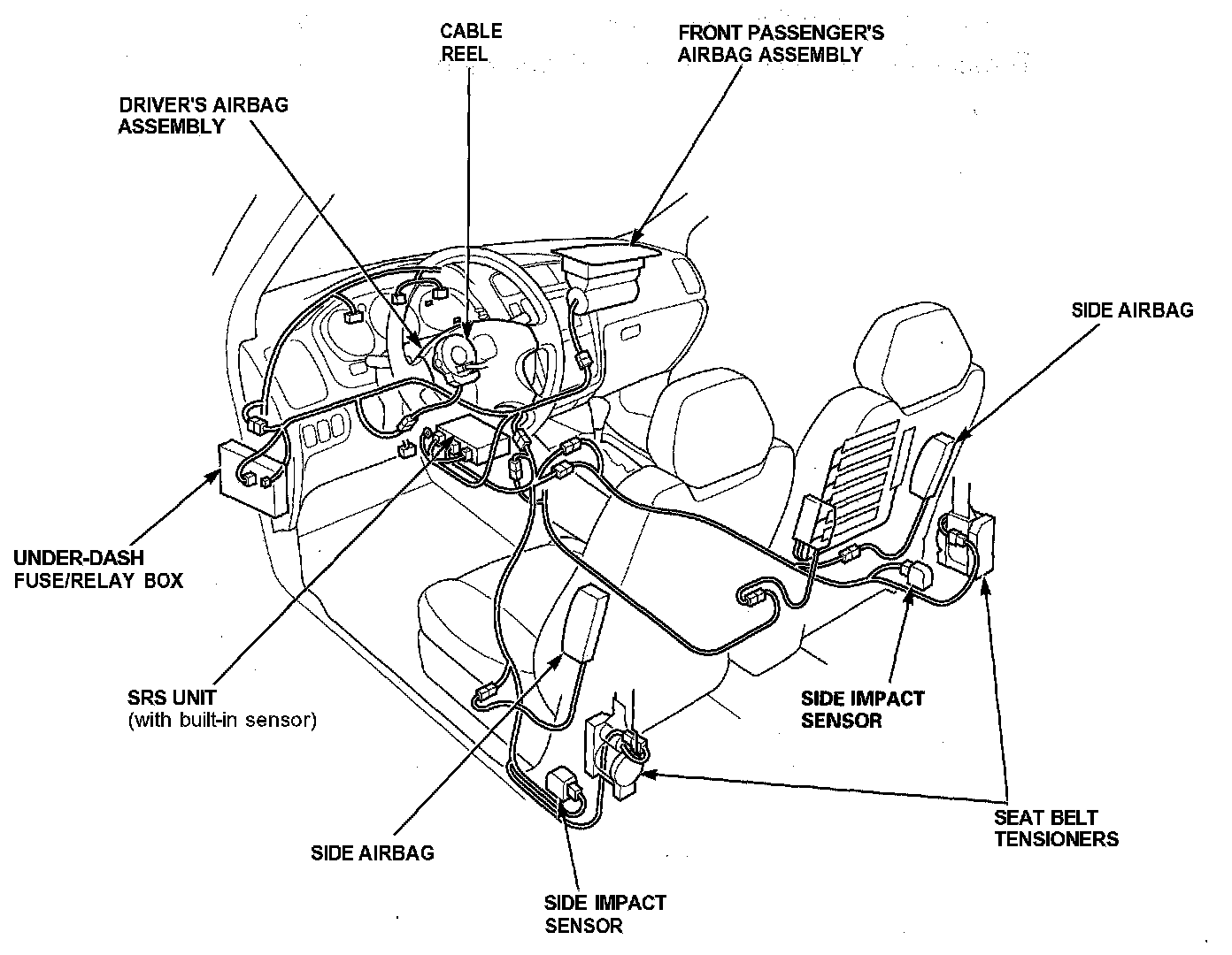 Supplemental Restraint System (SRS)This model has an SRS which includes a driver's airbag in the steering wheel hub, a passenger's airbag in the dashboard above the glove box, seat belt tensioners in the front seat belt retractors, and side airbags in the front seat backs. The SRS unit is separate from the airbag assembly and has built-in sensors. The following precautions should be observed when performing sheet metal work, paint work, and repair work around the locations of the SRS components.