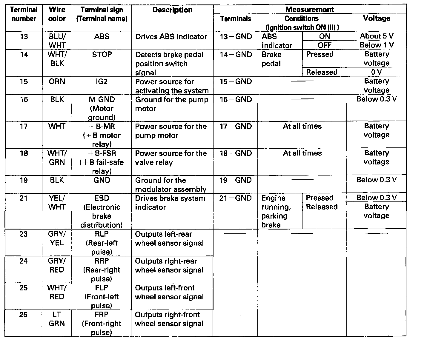 ABS Control Unit Inputs and Outputs for 31P ConnectorPart 1 of 2