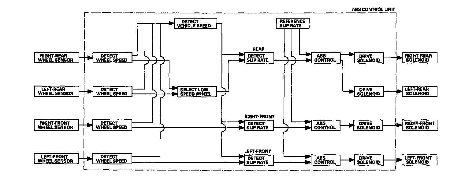 The ABS control unit detects the wheel speed based on the wheel sensor signal it received, then it calculates the vehicle speed based on the detected wheel speed. The control unit detects the vehicle speed during deceleration based on the rate of deceleration.