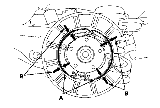 4. Measure the parking brake lining thickness (B). Measurement does not include brake shoe thickness.