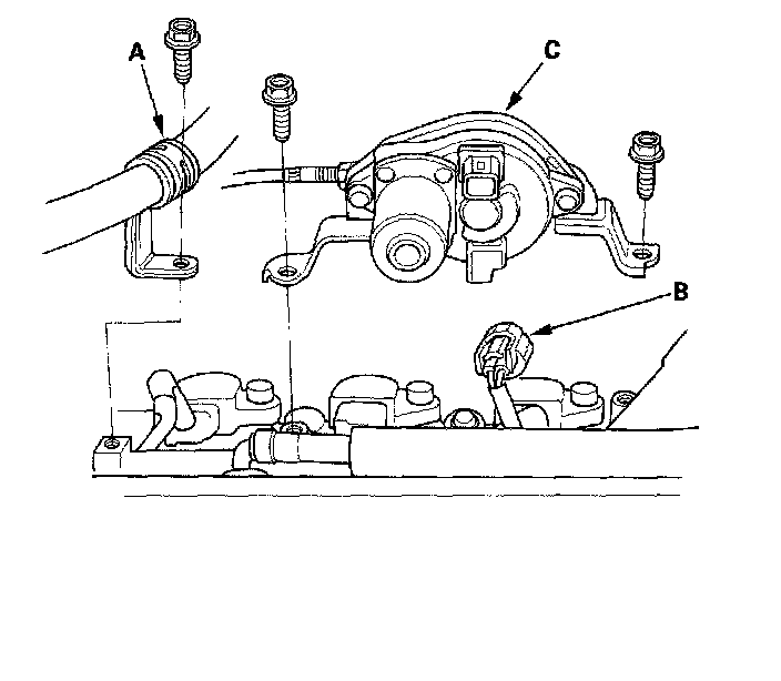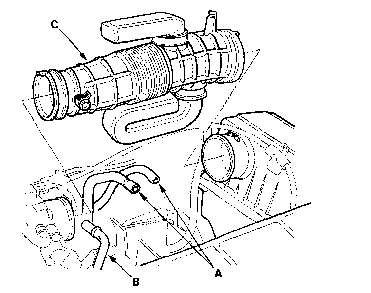 2. Remove the vacuum hoses (A) and breather pipe (B), then remove the intake air duct (C).