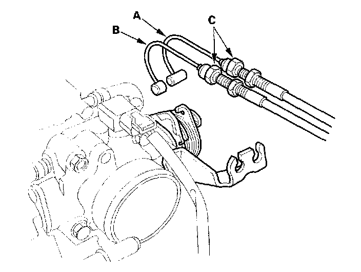 3. Remove the throttle cable (A) and cruise control cable (B) by loosening the locknuts (C), then slipping the cable ends out of the accelerator linkage. Take care not to bend the cables when removing them. Always replace any kinked cable with a new one.