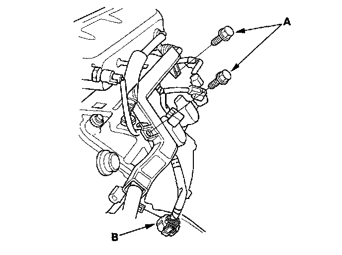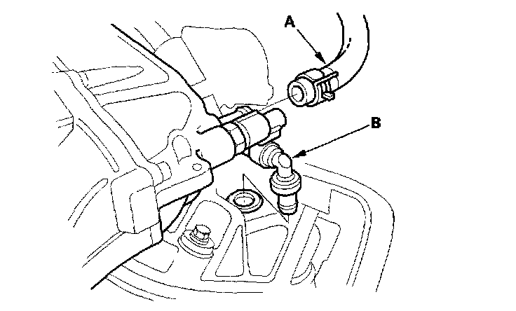 5. Remove the brake booster vacuum hose (A) and positive crankcase ventilation (PCV) hose (B).
