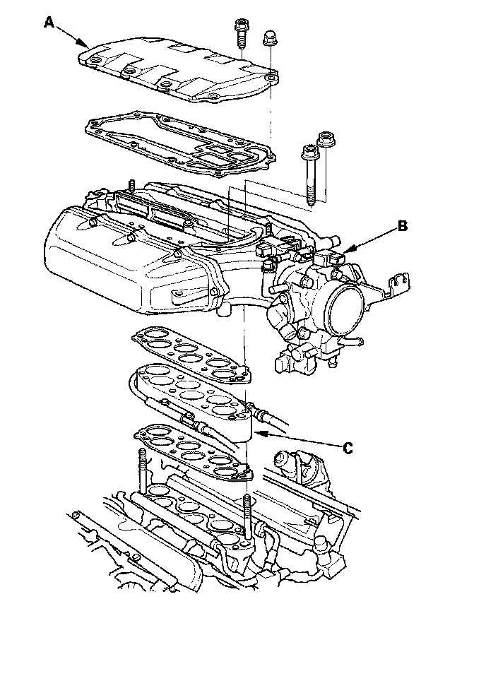 10. Remove the upper cover (A), then remove the intake manifold assembly (B) and spacer (C).