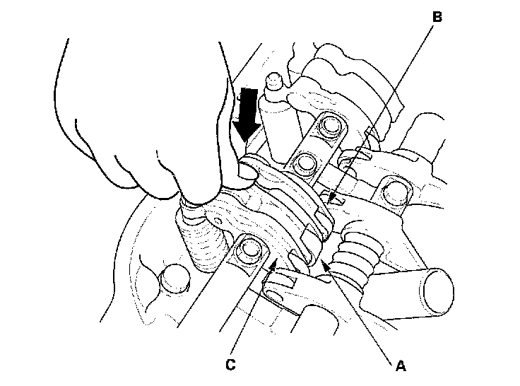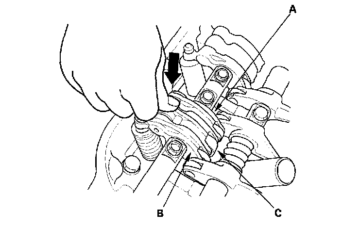 13. Push on the intake mid rocker arm (A) for the No. 1 cylinder. The mid rocker arm should move independently of the primary rocker arm (B) and secondary rocker arm (C).