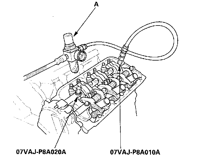 18. Remove the two end intake rocker shaft mounting bolts, then install and connect the special tools and an air pressure regulator with a 0 - 100 psi gauge (A).