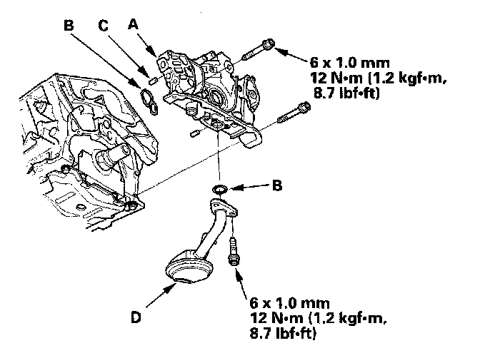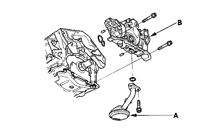 8. Remove the mounting bolts and the oil pump assembly (B).