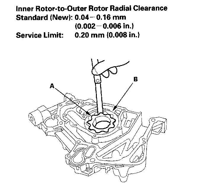 10. Check the inner-to-outer rotor radial clearance between the inner rotor (A) and outer rotor (B). If the inner-to-outer rotor clearance exceeds the service limit, replace the oil pump assembly.