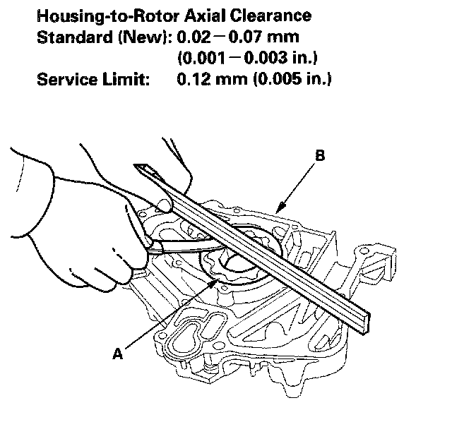 11. Check the housing-to-rotor axial clearance between the rotors (A) and pump housing (B). If the housing-to-rotor axial clearance exceeds the service limit, replace the oil pump assembly.