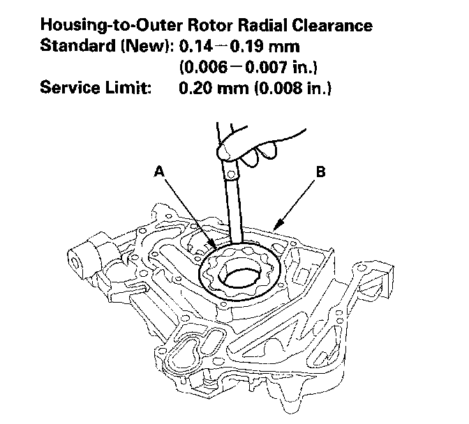 12. Check the housing-to-outer rotor radial clearance between the outer rotor (A) and pump housing (B). If the housing-to-outer rotor radial clearance exceeds the service limit, replace the oil pump assembly.