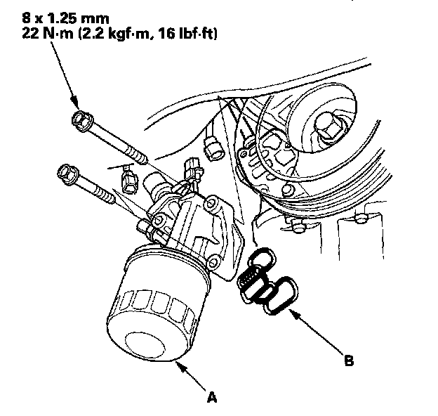3. If the resistance is within specifications, remove the VTEC solenoid valve/oil filter assembly (A) from the oil pump, and check the VTEC solenoid valve filter (B) for clogging. If there is clogging, replace the VTEC solenoid valve filter, the engine oil filter, and the engine oil.