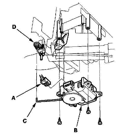Air Mix Control Motor Replacement1. Disconnect the 7P connector (A) from the air mix control motor (B). Remove the rod (C) of the air mix control motor from the air mix control linkage (D). Remove the self-tapping screws and the air mix control motor from the heater unit.