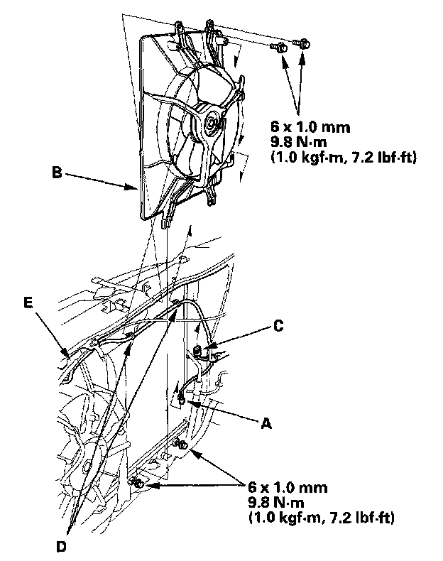 6. Remove the compressor clutch connector (A) from the condenser fan shroud (B), then disconnect the connector. Disconnect the condenser fan connector (C), then remove the wire harness clips (D) from the condenser fan shroud. Remove the cruise control actuator cable (E) from the clamp. Loosen the lower mounting bolts, then remove the upper mounting bolts and the condenser fan shroud. Be careful not to damage the radiator fins when removing the condenser fan shroud.