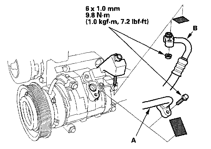 7. Remove the bolt and the nut, then disconnect the suction line (A) and discharge line (B) from the compressor. Plug or cap the lines immediately after disconnecting them to avoid moisture and dust contamination.