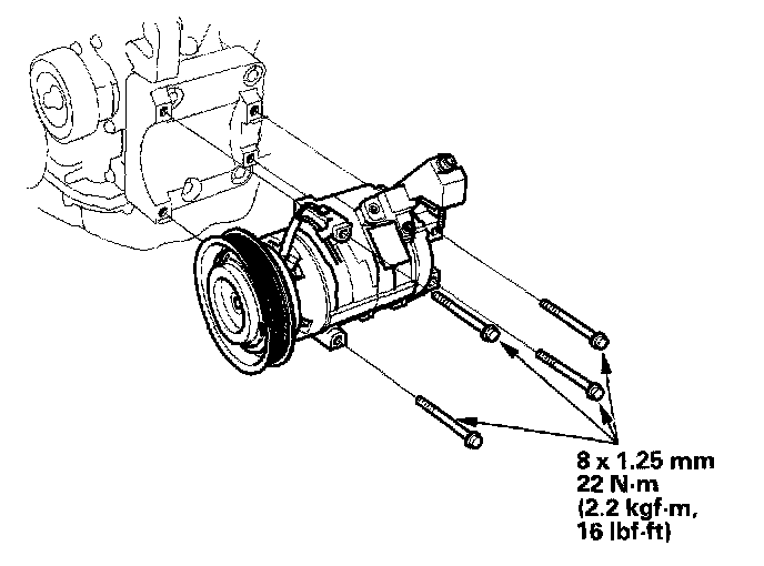 8. Remove the mounting bolts and the compressor. Be careful not to damage the radiator fins when removing the compressor.