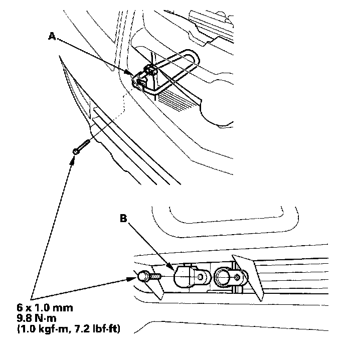 3. Remove the clips (A), then remove the bolts and the radiator upper mount brackets (B).
