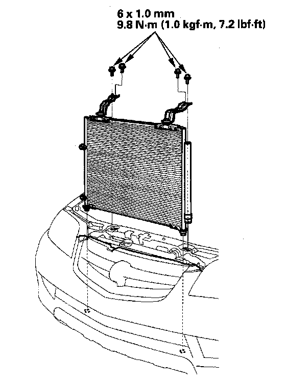 5. Remove the bolts, then remove the condenser by lifting it up. Be careful not to damage the radiator and condenser fins when removing the condenser.