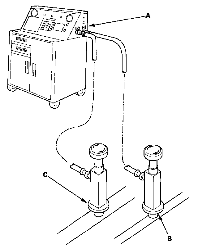 1. Connect a R-134a refrigerant recovery/recycling/charging station (A) to the high-pressure service port (B) and the low-pressure service port (C), as shown, following the equipment manufacturer's instructions.
