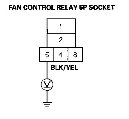 4. Measure the voltage between the No. 5 terminal of the fan control relay 5P socket and body ground.