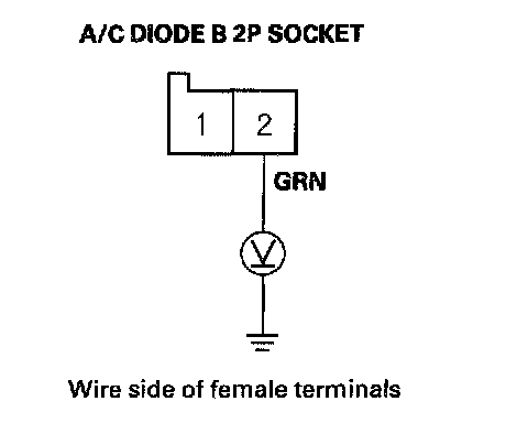4. Measure the voltage between the No. 2 terminal of A/C diode B 2P connector and body ground.