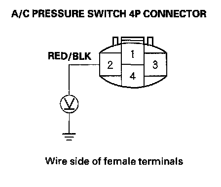 9. Measure the voltage between the No. 2 terminal of the A/C pressure switch 4P connector and body ground.