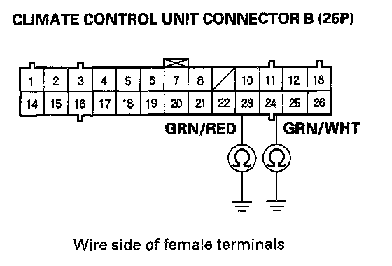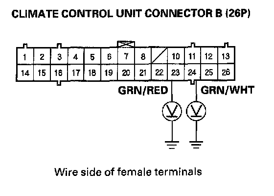 8. Check for continuity between the No. 23 and No. 24 terminals of climate control unit connector B (26P) and body ground individually.