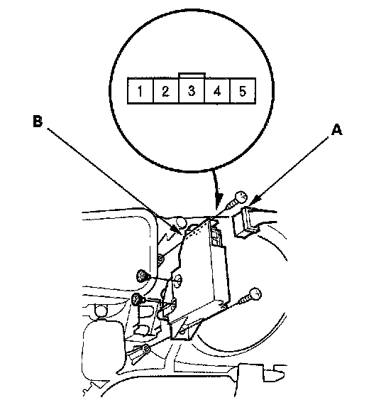 1. Remove the instrument panel.2. Disconnect the 5P connector (A) from the select/ reset switch (B).