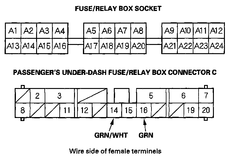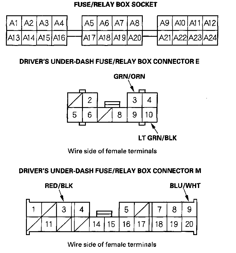 For driver's under-dash fuse/relay box connector socket location.