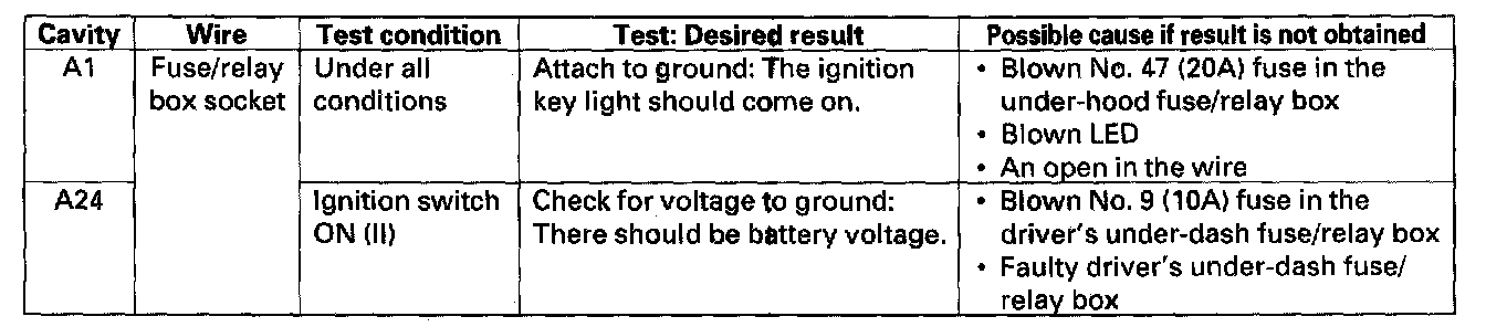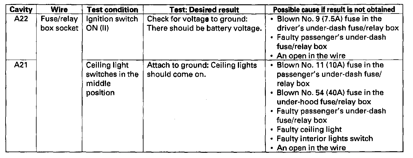 8. With the passenger's multiplex control unit still disconnected, make these input tests at the connector and passenger's under-dash fuse/relay box socket.