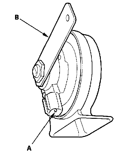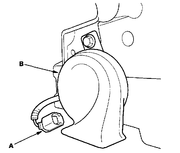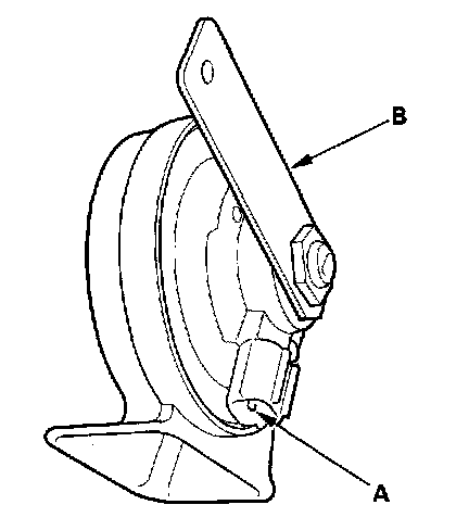 4. Test the horn by connecting battery power to the terminal (A) and grounding to the bracket (B). The horn should sound.