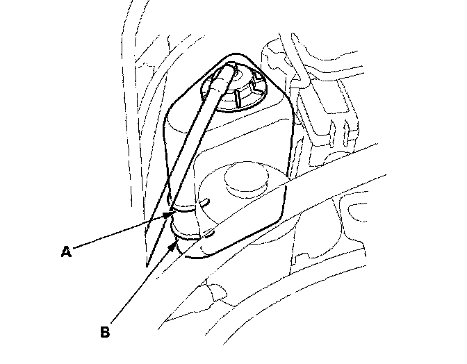 Coolant Check1. Look at the coolant level in the coolant reservoir. Make sure it is between the MAX mark (A) and MIN mark (B).