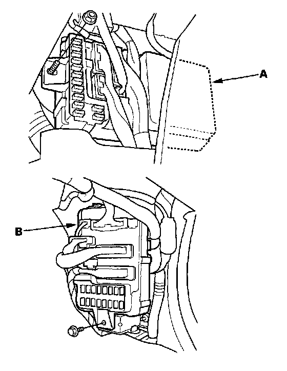 4. Remove the mounting bolt, and pull the driver's under-dash fuse/relay box (A) or passenger's under-dash fuse/relay box (B) away from the body.